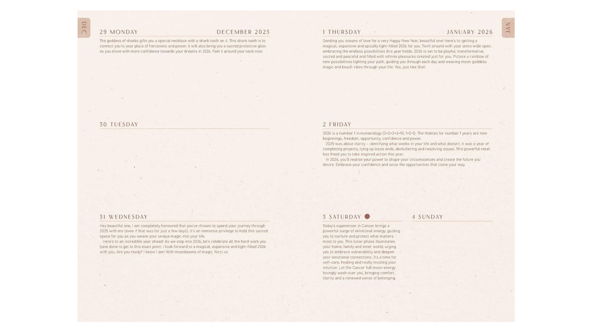 This full-colour, beautifully illustrated diary has been written with such love and care you will feel it flow effortlessly from its pages and into your life. It will teach you how to harness the energy and guidance of the moon, the seasons and the sacred celebrations of 2025 so you can thrive throughout your whole year. You will learn how to use crystals, essential oils, affirmations, rituals and songs to harness your potency, your inner goddess. This diary will guide you through 2026, teaching you to live inharmony and alignment with the moon and Mother Nature, transforming your life into one of clarity, balance, ease and joy.